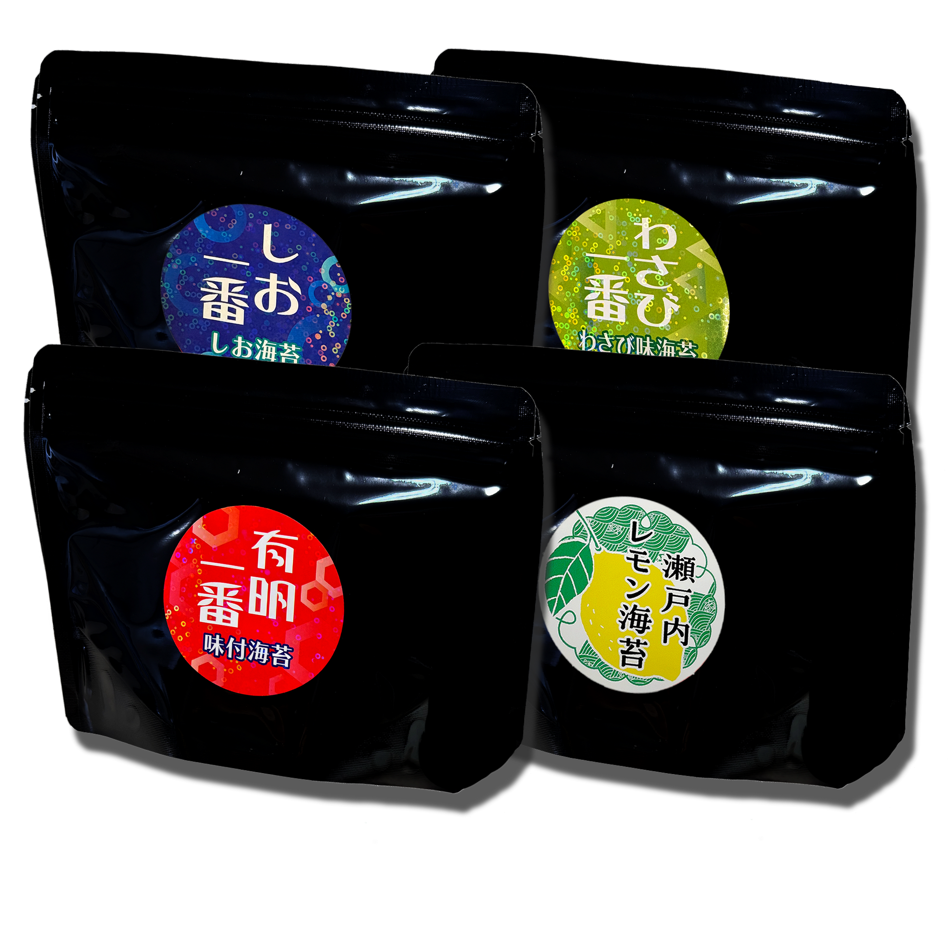 ●定番の味付け海苔、塩のり、わさび味のり、レモン味付海苔の各種1袋ずつのセットです。
